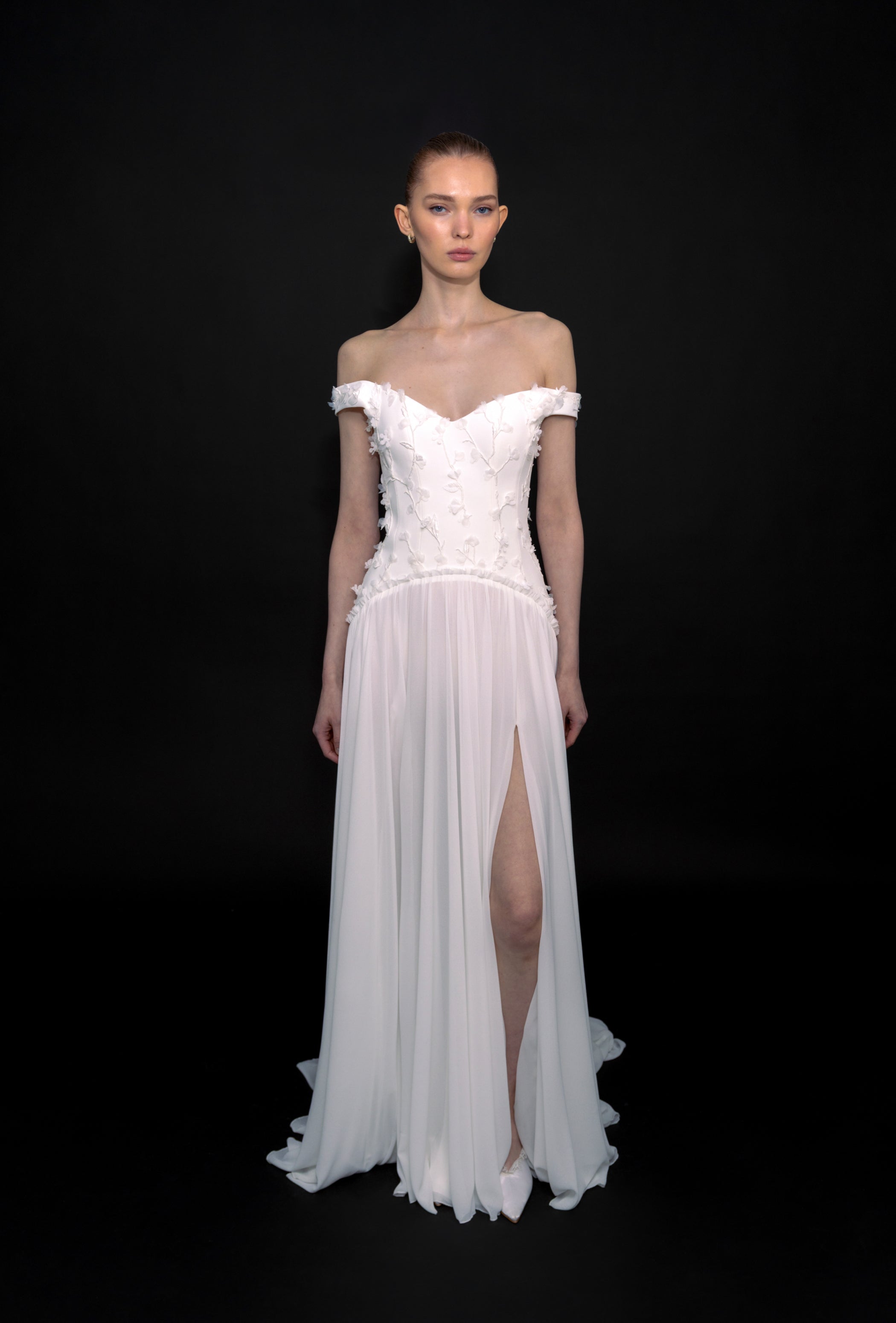 A soft, romantic silhouette with a light, effortless feel, this gown features an off-shoulder lace bodice paired with a flowing chiffon skirt. The delicate texture contrasts with the fluid movement, while a high slit adds a subtle, modern edge.