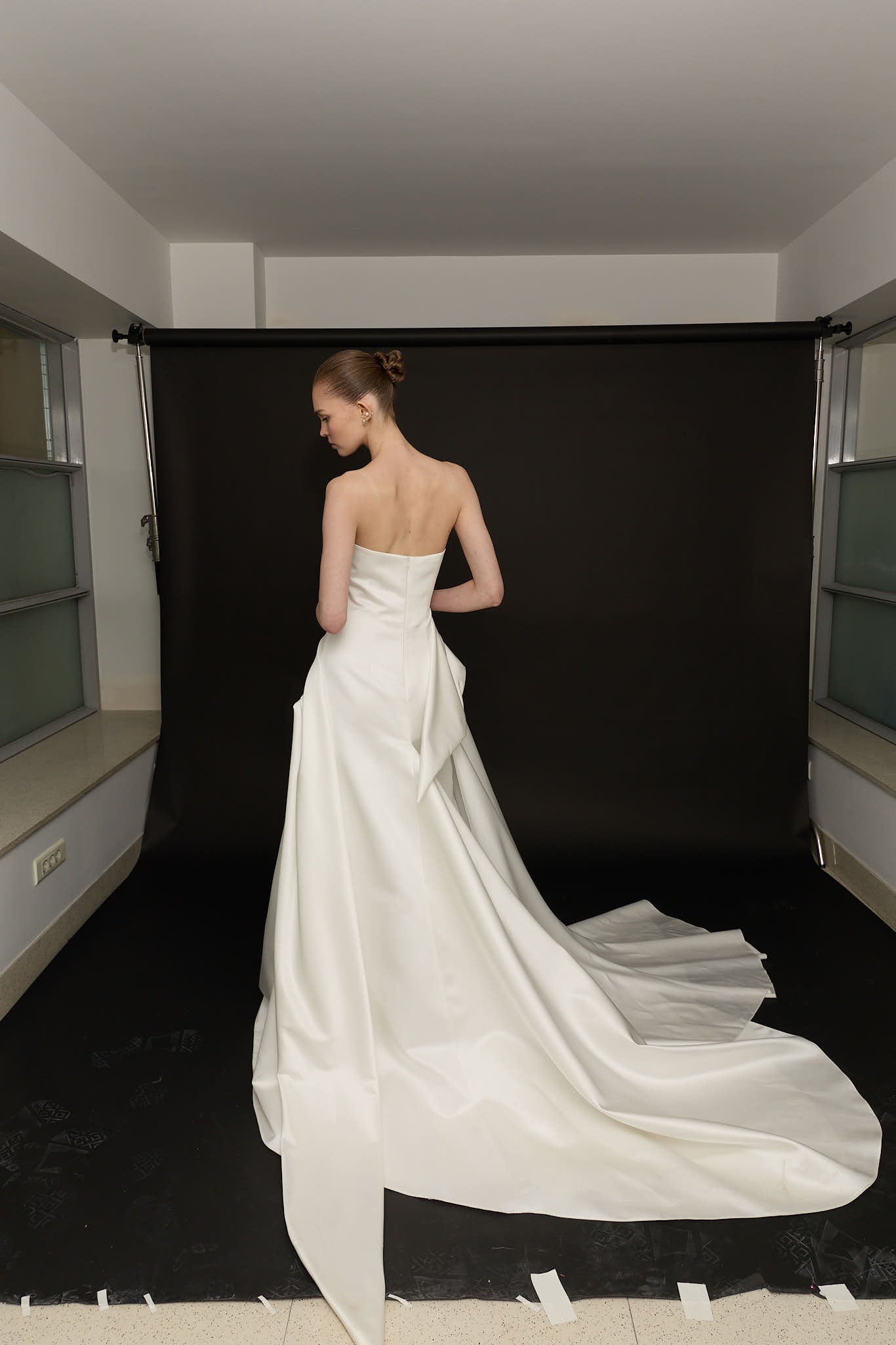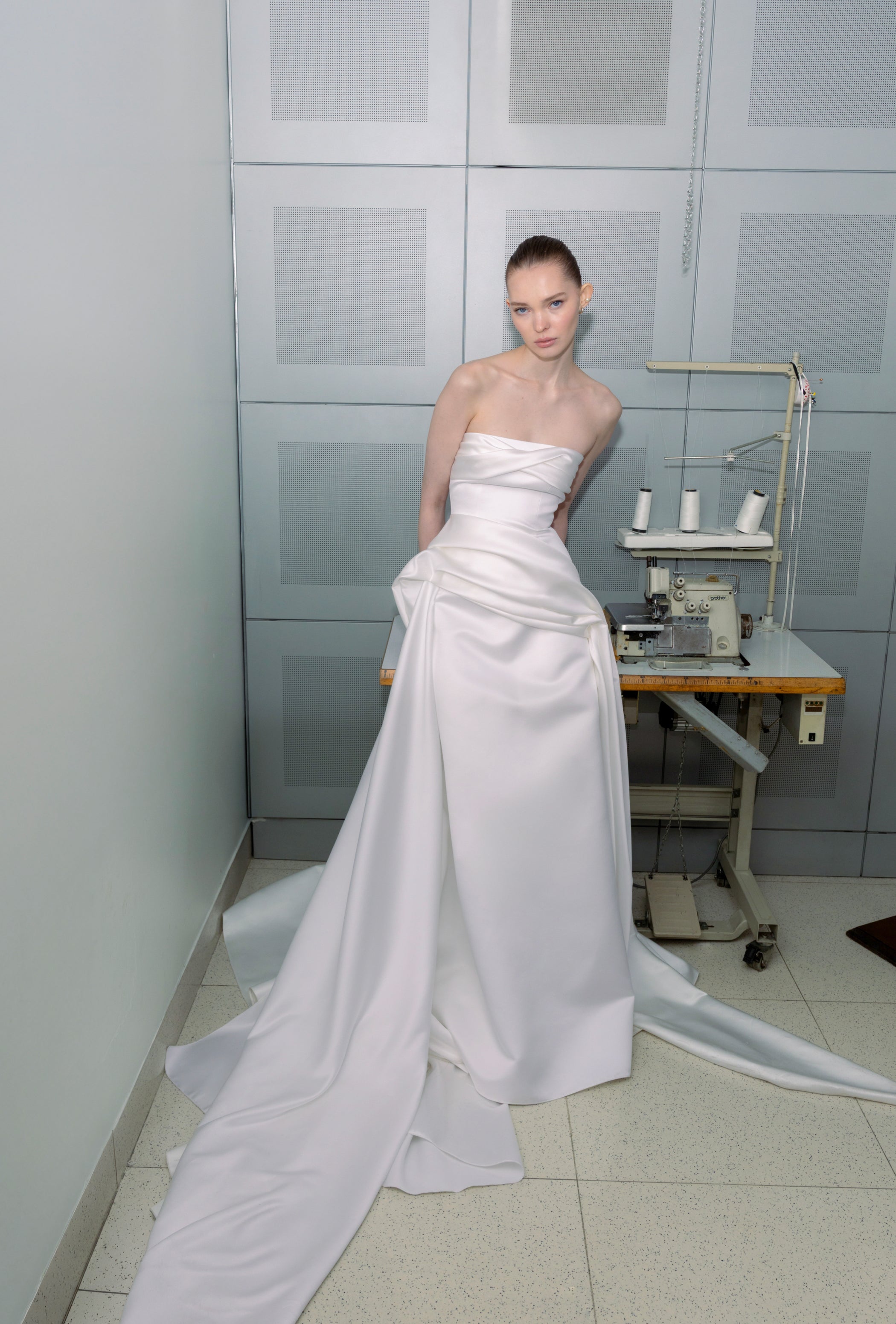 A refined take on modern bridal, this strapless gown is defined by its softly folded neckline and controlled draping through the waist. Cut from structured satin, the silhouette opens into a voluminous skirt with a fluid yet confident presence.